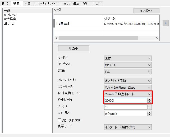 2passが重要! ビットレートはソース動画より大きめに値を設定。